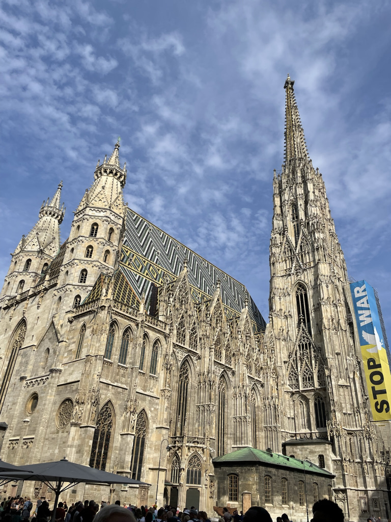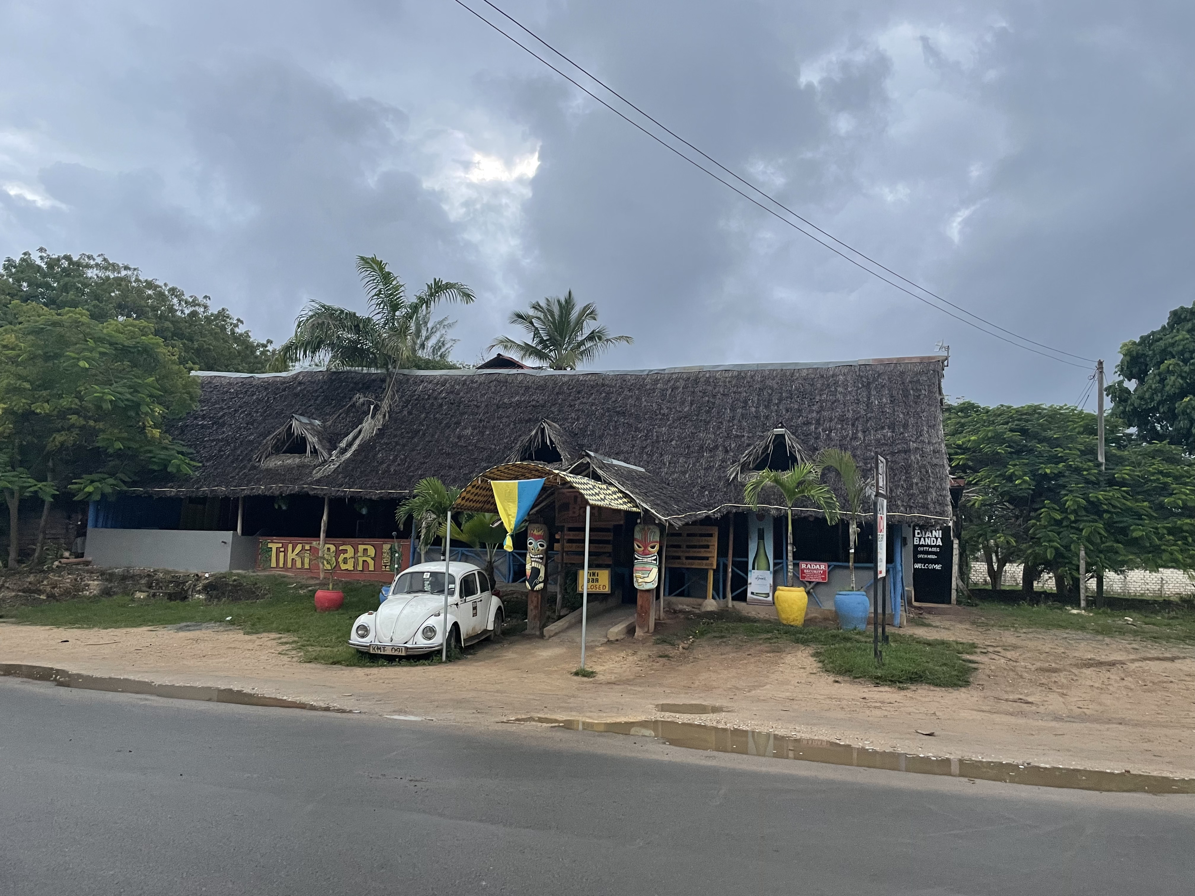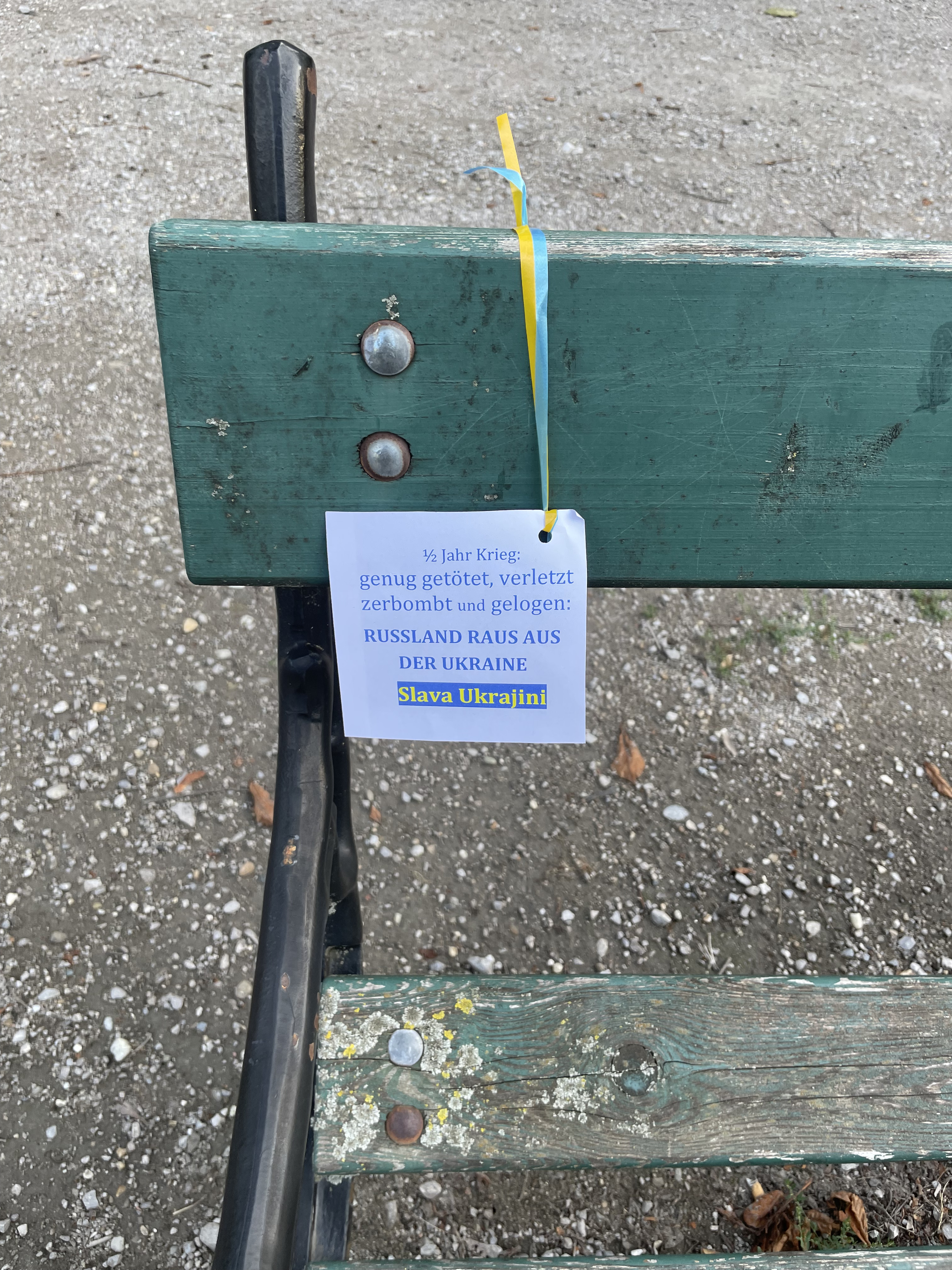 Photos (left to write): Anti war slogan and Ukrainian flag at St. Stephan Cathedral in central Vienna. Ukrainian theme at the entrance of the Tiki Bar, Diani Beach, Kenya. Ukrainian flag ribbon and card at Augarten Vienna today: “1/2 year war: Enough killing, maiming, bombing and lying: Russia out of Ukraine. Slava Ukrajini”